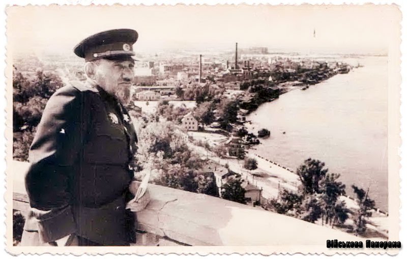 Герой Радянського Союзу командир Сумського партизанського з’єднання Сидір Артемович Ковпак (сидить у центрі, на грудях зірка Героя) в оточенні соратників. Ліворуч від Ковпака — начальник штабу Г.Я.Базима, праворуч від Ковпака — помічник командира по господарству М.І.Павловський