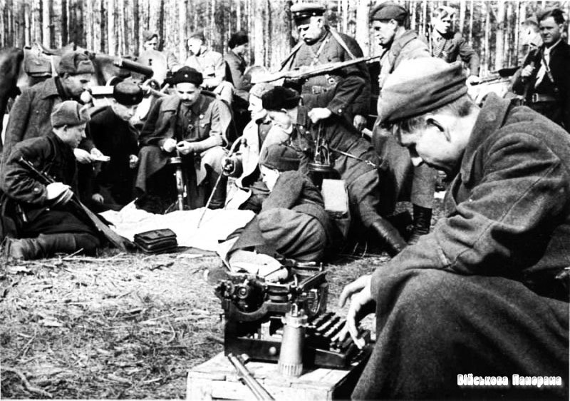 Штаб Сумського партизанського з’єднання на чолі з С.А.Ковпаком обговорює майбутню операцію. У центрі біля карти сидять командир з’єднання Сидір Артемович Ковпак і комісар Семен Васильович Руднєв. На передньому плані один із партизанів щось друкує на друкарській машинці