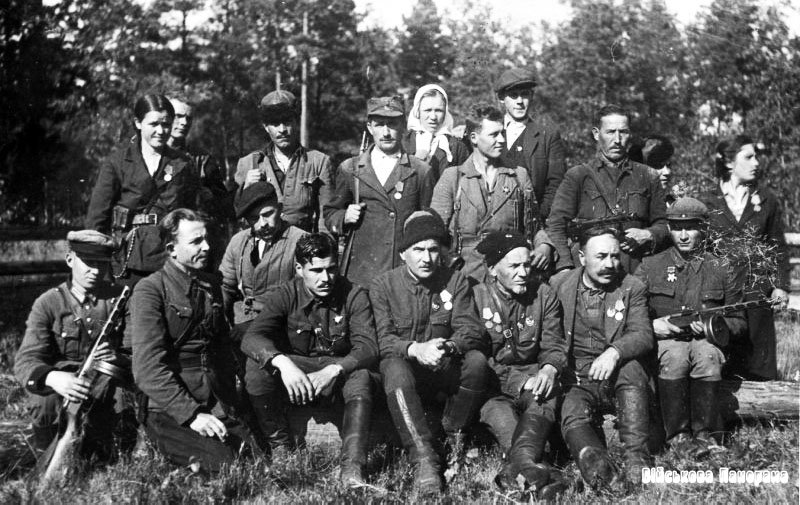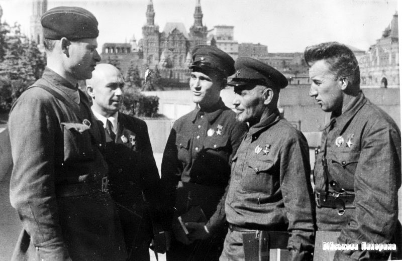 Командири партизанських формувань спілкуються один з одним після вручення урядових нагород. Зліва направо: командир партизанської бригади імені Кравцова на території Брянської області Михайло Ілліч Дука, командир Брянського районного партизанського загону Михайло Петрович Ромашин, командир Об’єднаних партизанських загонів і бригад Брянської та Орловської областей Дмитро Васильович Емлютін, командир Путивльського загону Сидір Артемович Ковпак, командир партизанського з’єднання Сумської і Брянської областей Олександр Миколайович Сабуров